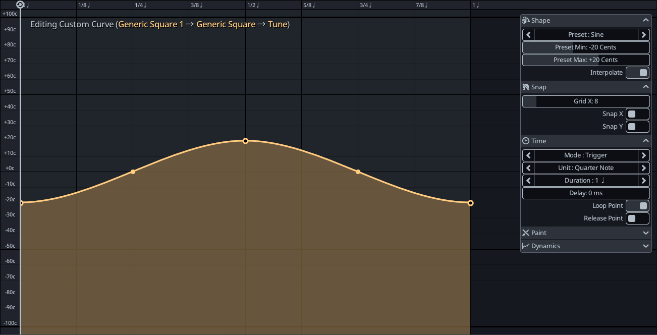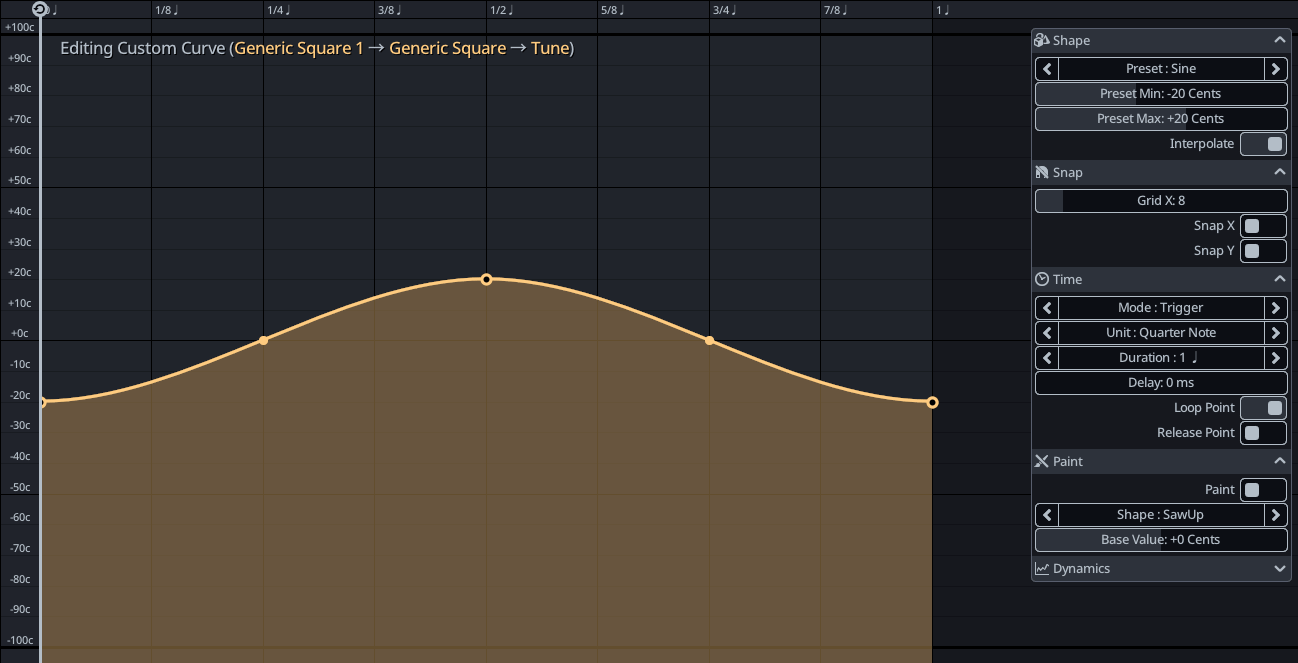 - For custom curves and sequences, these presets can be adjusted to a min/max range. For example, to create a simple vibrato, choose the sine present and adjust to the desired range.