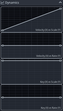 - Velocity (X) vs. Scale (Y) : How the velocity note parameter in the piano roll affects the scale/intensity of the curve. By default, there is a 1:1 relationship so the velocity essentially acts like a volume control.