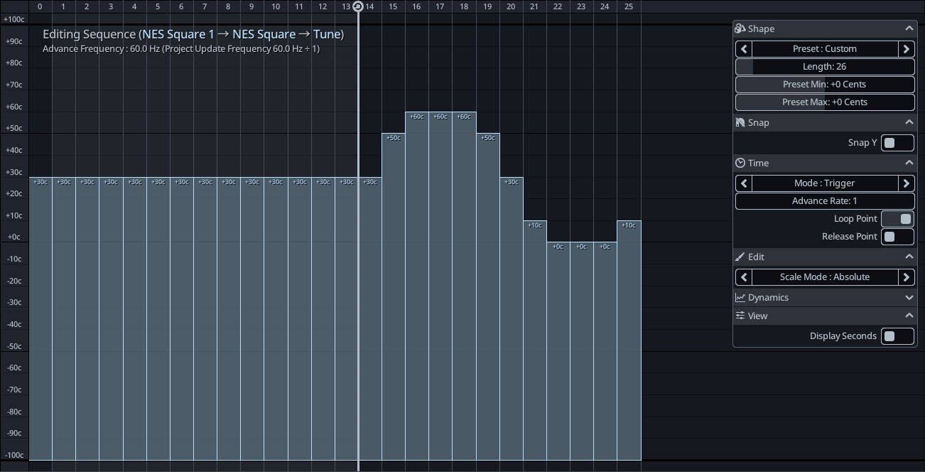 Sequence : Sequences are discrete series of numbers, represented as a bar graph. They mostly exist to give more granual control over the values when running at low update rates and trying to reproduce the behavior of retro consoles (e.g. sound like a console that ran at 60Hz). For this reason, the speed at which they they advance is intimately tied to the update rate of your project.