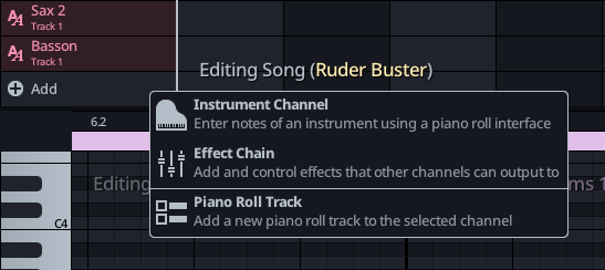 Additionally, if there is a selected channel, you'll have the option to add a piano roll track to it. Having multiple piano roll track on a channel is mostly for your own organization, although there are some cases where it is genuinely useful (arpeggios, playing the same note twice, etc.).