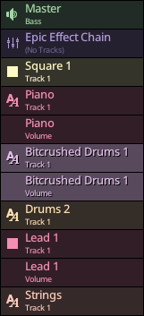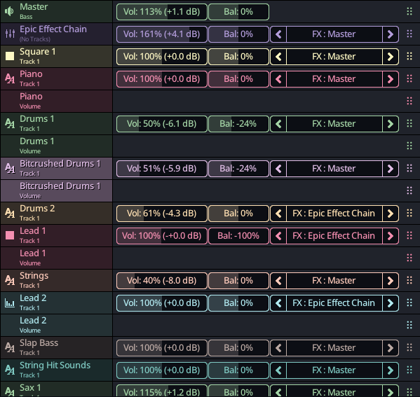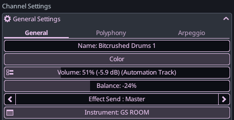 These parameters are explained more in depth in the project explorer section of the documentation, but this is where you can change the name, color, volume, balance and effect send of a specific channel. Individual tracks cannot be renamed.
