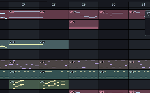 Patterns have an associated 3-digit numbers. This number is a unique pattern on a given track and allows you to tell if a pattern is used multiple times inside a track. Re-using a pattern multiple times in a track is called instancing. When modifying a pattern, all of the its instances will be modified at the same time.