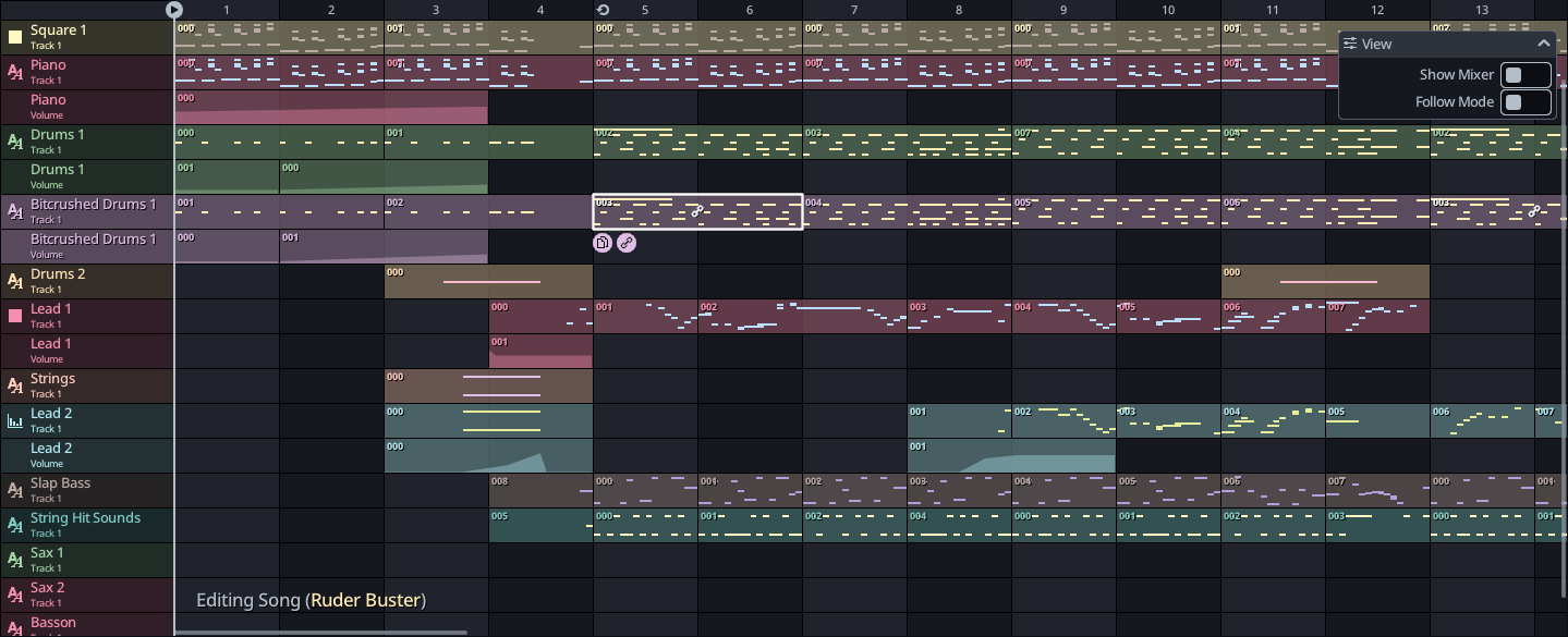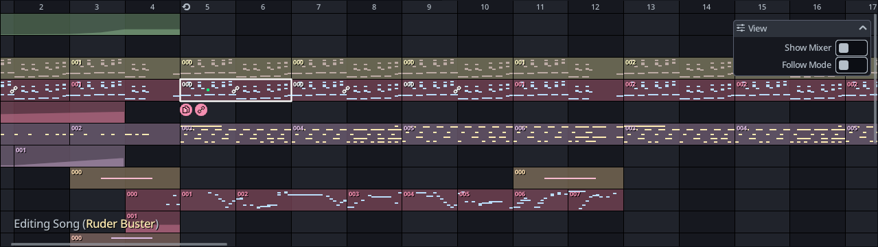 The Sequencer (or Pattern Editor) displays a grid of patterns and it is where you will edit the high level structure of your song.