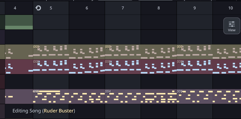 Each column of the sequencer represents exactly 1 Bar of music, and each row represent a Track. A track is always part of a Channel and will display the color of its parent channel. A channel may have zero or more tracks.